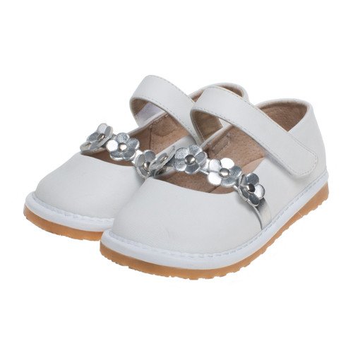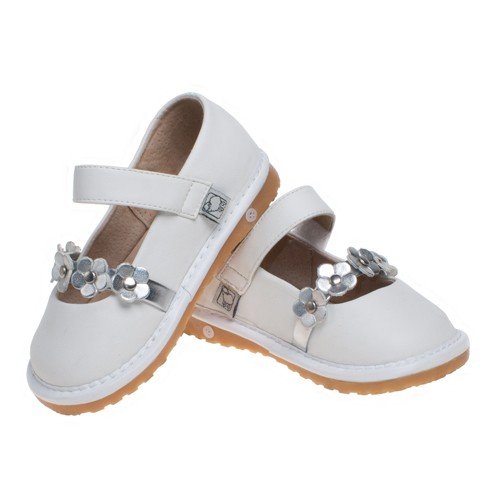 Туфельки белого цвета с чудными цветочками на ремешке нашивки цвета серебряный металлик. На ножке фиксируются с помощью липучки. Великолепно подходят и специально спроектированы для детей от 1 года до 3 лет. Широкие, удобные, износостойкие. Пищалки усиливают интерес детей к ходьбе и помогают практиковаться. При необходимости легко меняются на заглушки. Подходят на высокий подъем.