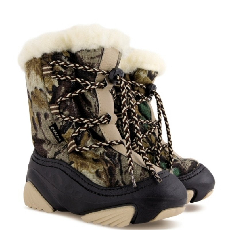 Польские детские зимние дутики Demar защитной расцветки, спереди на шнуровке для удобства одевания. Шнурки с фиксатором (завязывать их не надо).
