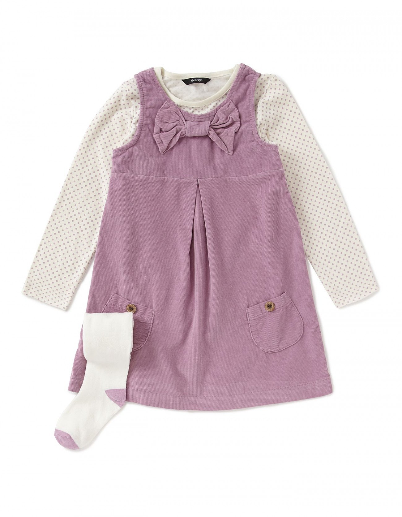 В комплект входит: регланчик с длинным рукавом в горох, сарафанчик с бантиком в фиолетовых тонах и колготки в тон комплекта.