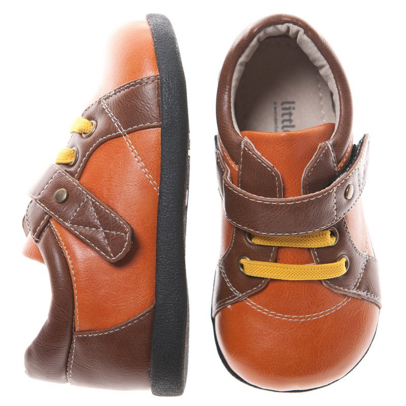 Туфельки оранжевого цвета с коричневыми вставками и внутренней окантовкой. На резинках желтого цвета "под шнуровку" вверху фиксируются на липучке.Великолепно подходят и специально спроектированы для детей от 2х до 4х лет с учетом роста детской стопы. Сделаны из натуральной кожи с надежной подошвой из современного износостойкого материала TPR. Легкие, удобные, дышащие, мягкие внутри.