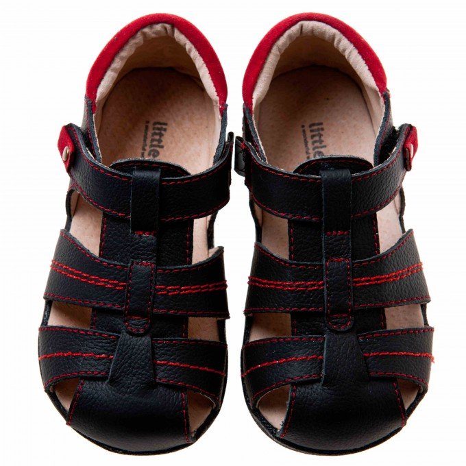 Санлали черного цвета с закрытым носком и пяткой с яркими декоративными строчками красного цвета. На ножке фиксируются с помощью липучки. Великолепно подходят и специально спроектированы для детей от 2х до 4х лет с учетом роста детской стопы. Сделаны из натуральной кожи с надежной подошвой из современного износостойкого материала TPR. Легкие, удобные, дышащие, мягкие внутри.