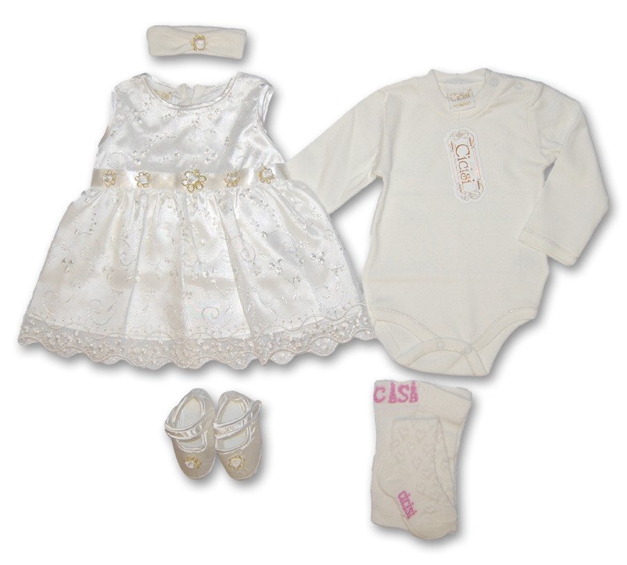 В комплект входит: кремовое платьице с коротким рукавом, бодик с длинным рукавом, колготки кремовые, повязочка и пинетки на завязочках. Комплект очень красиво украшен золотой нитью.