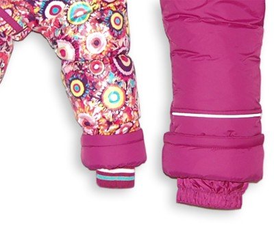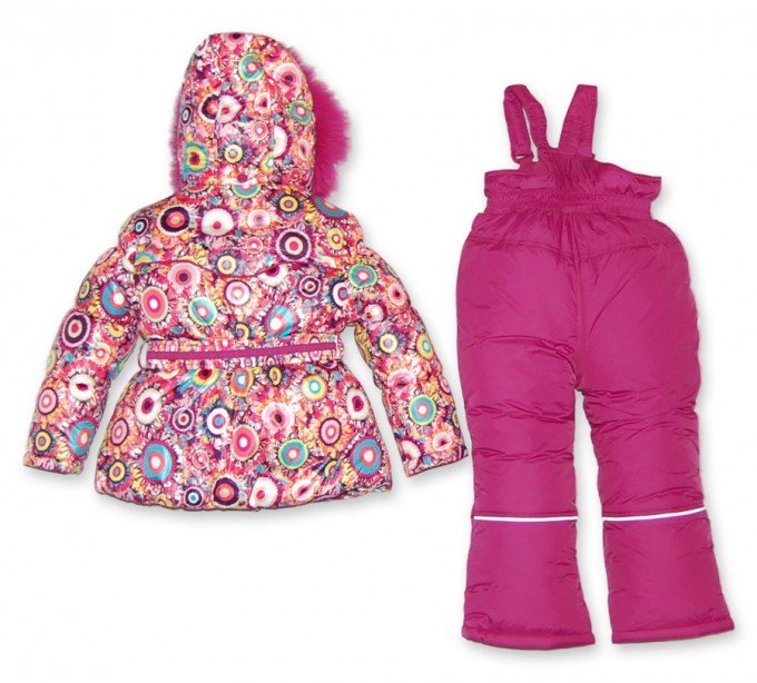 Расцветка - куртка: хаотичные круги (малиновых, розовых, голубых, желтых, сиреневых, бежевых цветов); полукомбинезон: малиновый.