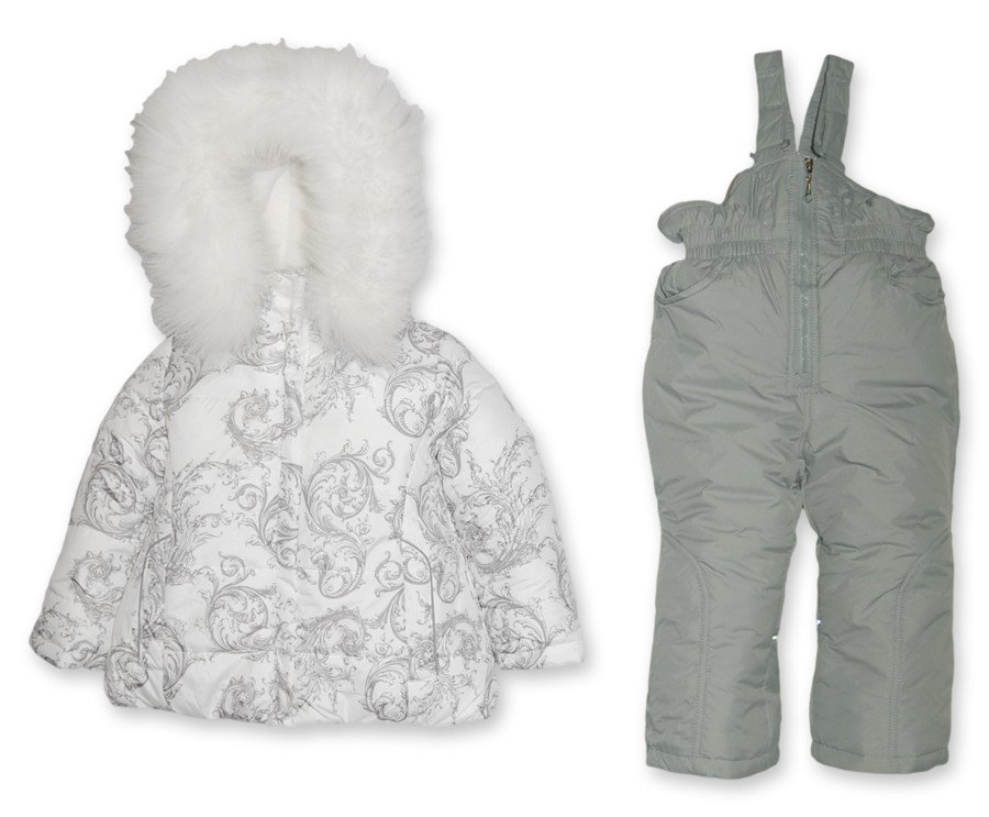 Расцветка - куртка: белоснежная с серым орнаментом; полукомбинезон: серый.