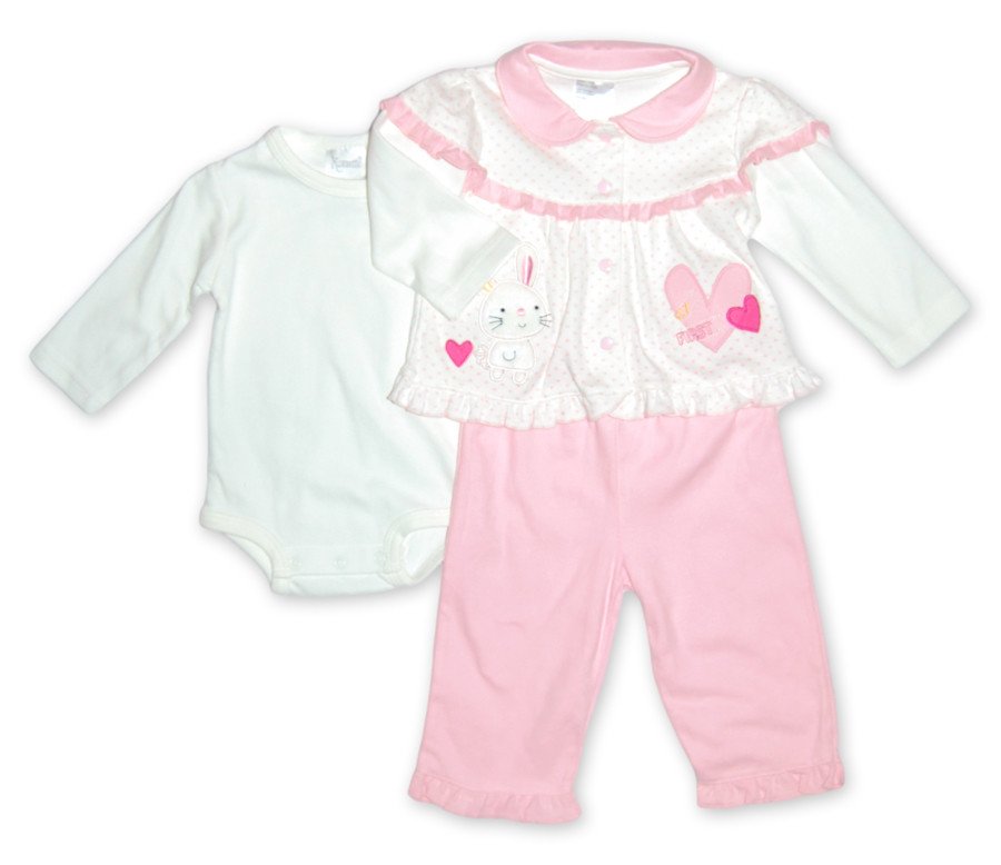 - трикотажная кофточка молочного цвета в маленьких розовых сердечках, с длинным рукавом, на 4-х кнопках, с аппликацией зайки и сердечка, с воротником и рюшами (по кокетке и низу кофты);