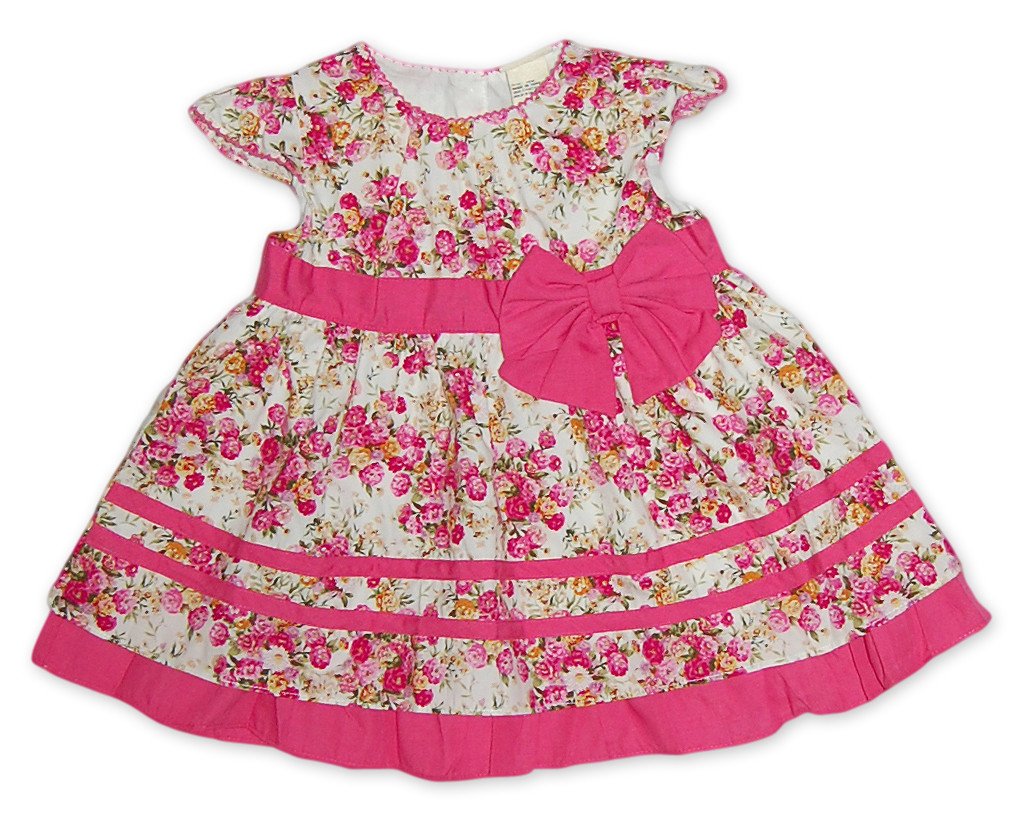 Очень красивое кремовое платье с узором из диких розочек. Яркая малиновая отделка на поясе, по юбке и нижней оборке платьица. Впереди нарядный бант.