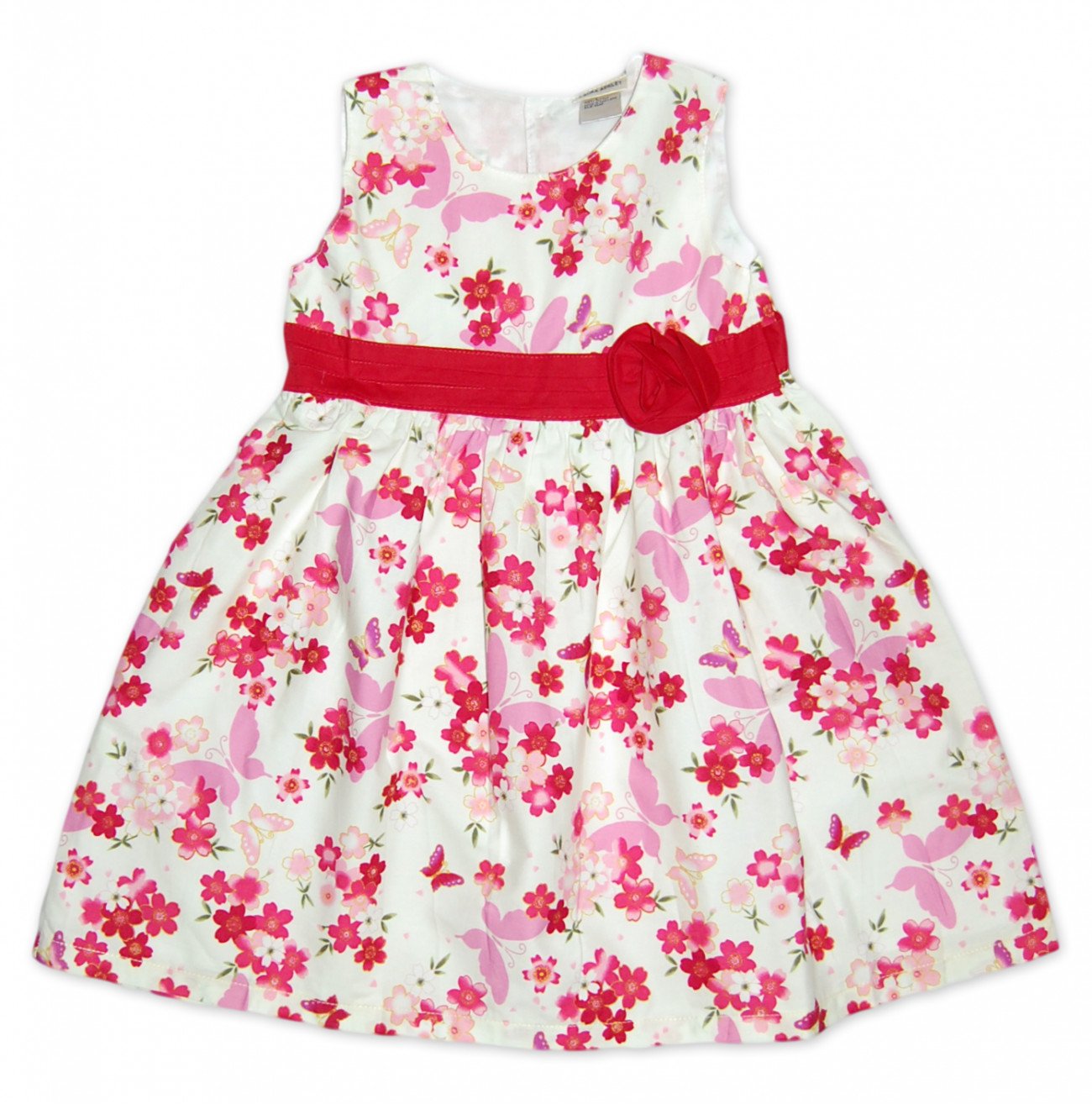 Необыкновенно красиво на кремовом фоне платья выделяются розовые бабочки с цветами в нежно-розовых и вишневых тонах. Дополняет картину красный пояс с розочкой.