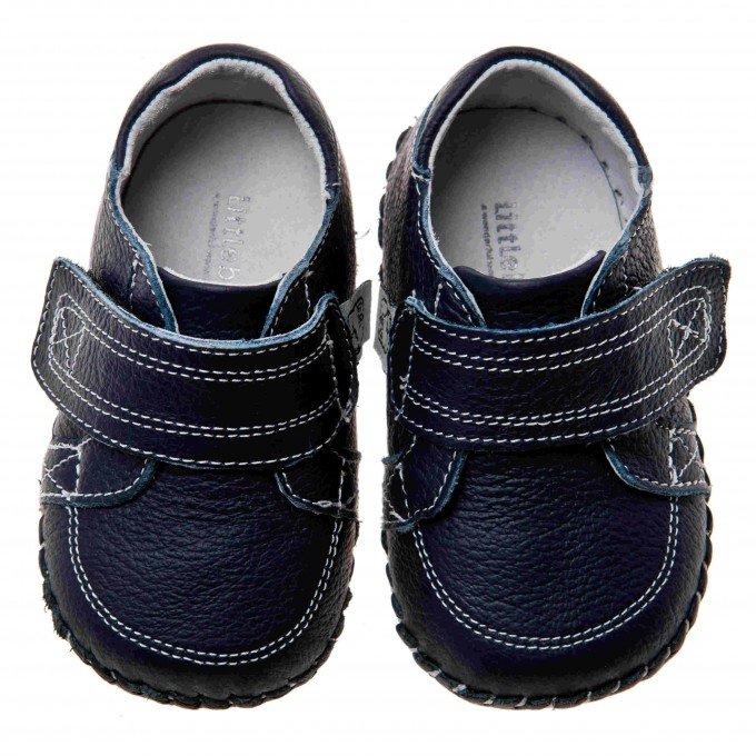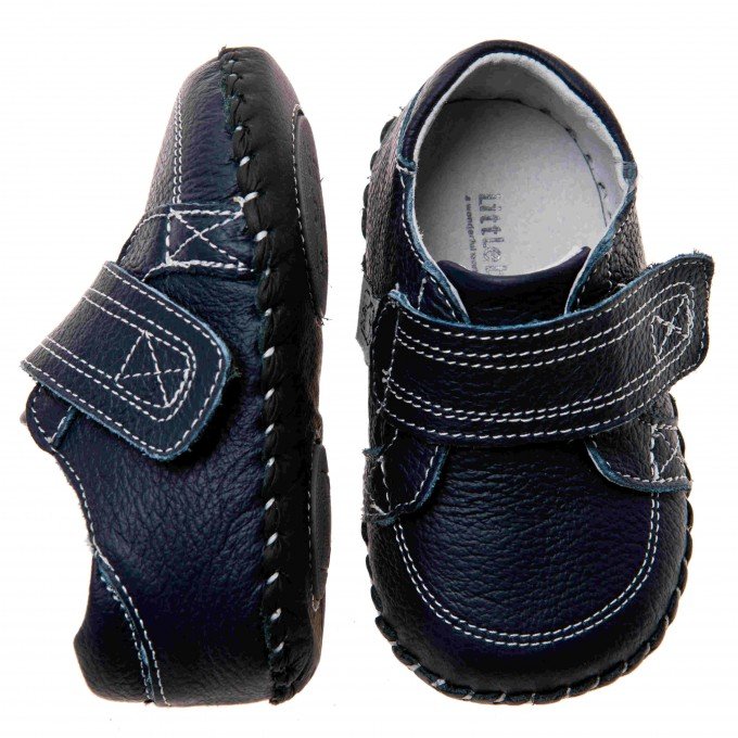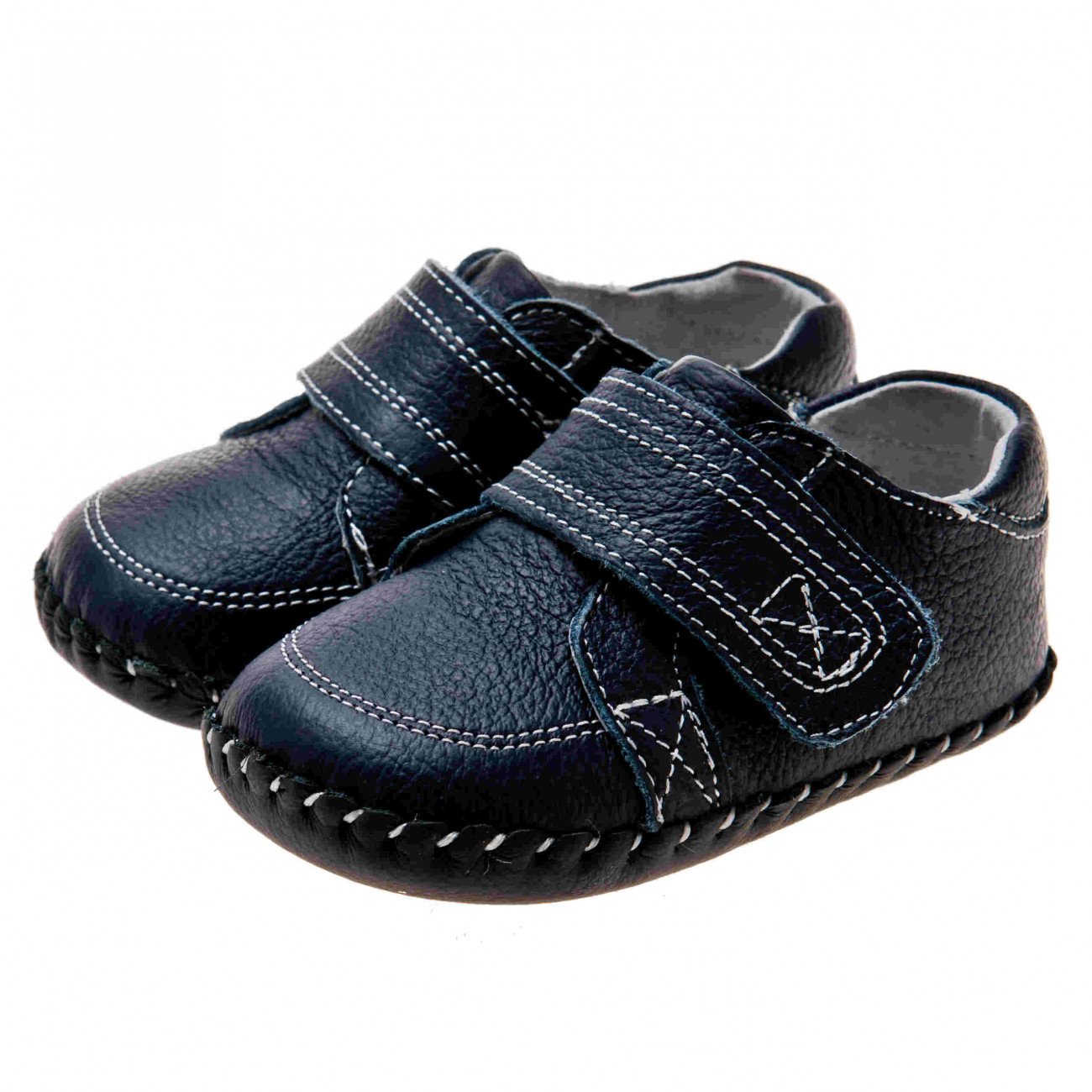 Чудные темно-синие кожаные топики для малыша с красивыми декоративными строчками белого цвета.