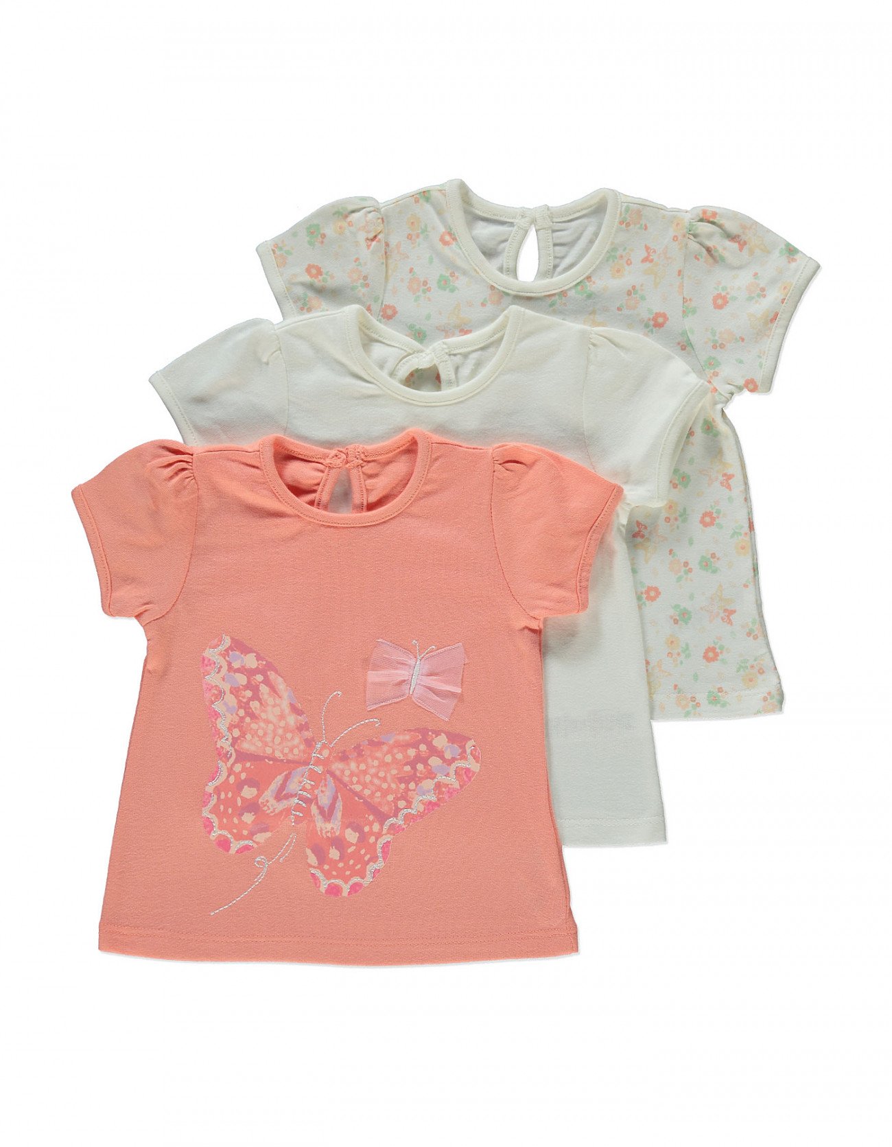 Комплект состоит из: трех футболочек - одна персиковая с бабочками, вторая - беленькая, третья - в мелкие цветочки.