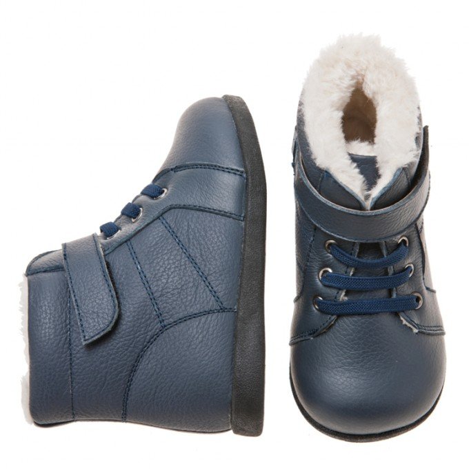Красивые кожаные ботиночки темно-синего цвета впереди с синими резинками под имитацию шнуровки и вверху фиксируются на ножке с помощью ремешка на липучке. Внутри утеплены искусственным мехом. Великолепно подходят и специально спроектированы для детей от 2х до 4х лет с учетом роста детской стопы. Сделаны из натуральной кожи с надежной подошвой из современного износостойкого материала TPR. Легкие, удобные, дышащие, мягкие внутри.