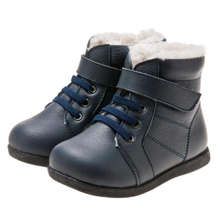 Красивые кожаные ботиночки темно-синего цвета впереди с синими резинками под имитацию шнуровки и вверху фиксируются на ножке с помощью ремешка на липучке. Внутри утеплены искусственным мехом. Великолепно подходят и специально спроектированы для детей от 2х до 4х лет с учетом роста детской стопы. Сделаны из натуральной кожи с надежной подошвой из современного износостойкого материала TPR. Легкие, удобные, дышащие, мягкие внутри.