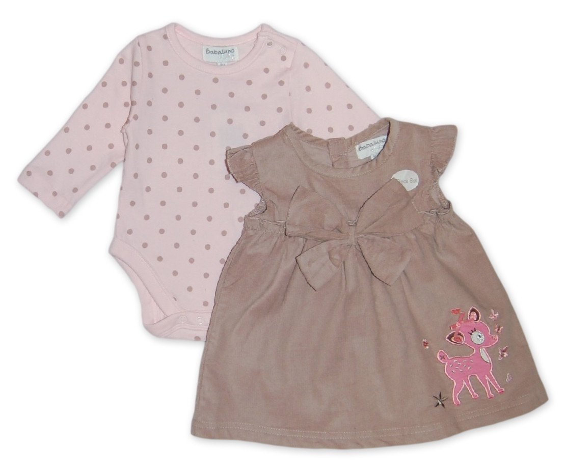 Модный комплект из нежно-розового бодика в горошек в тон сарафану, на плече и внизу под памперс на двух кнопочках и вельветового сарафана цвета кофе с молоком, с завышенной талией, впереди с бантом и внизу с аппликацией розового олененка, для удобства в одевании на спине застегивается на пуговицы по всей длине.