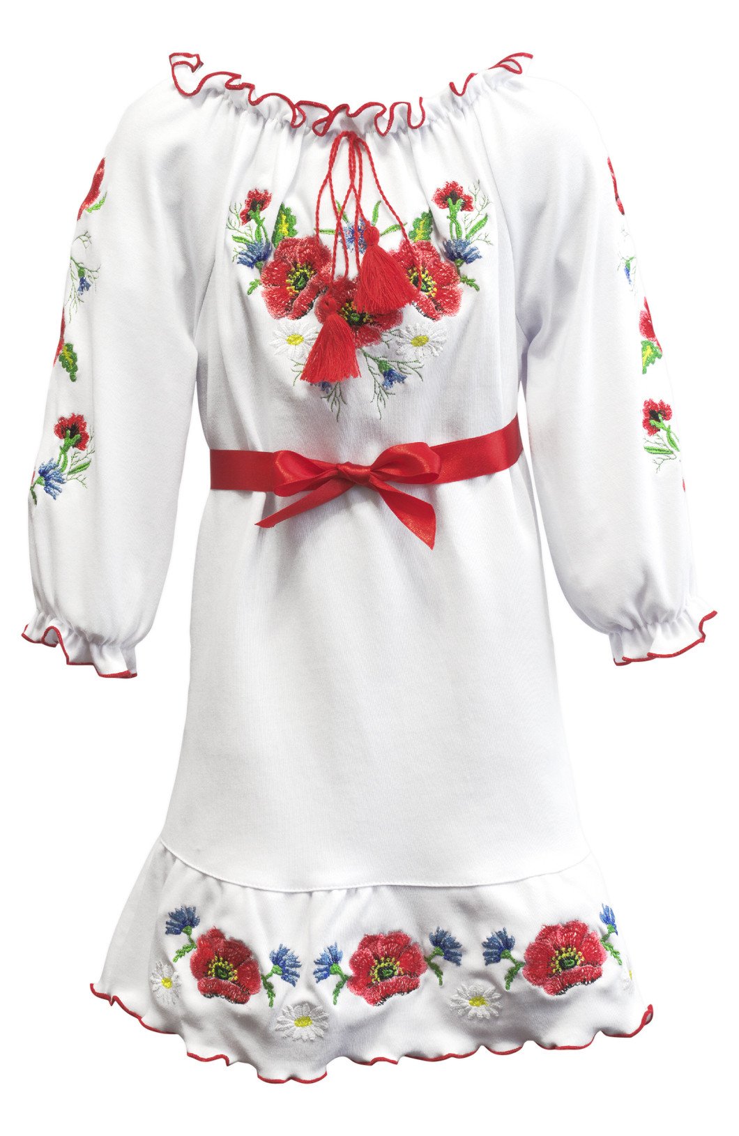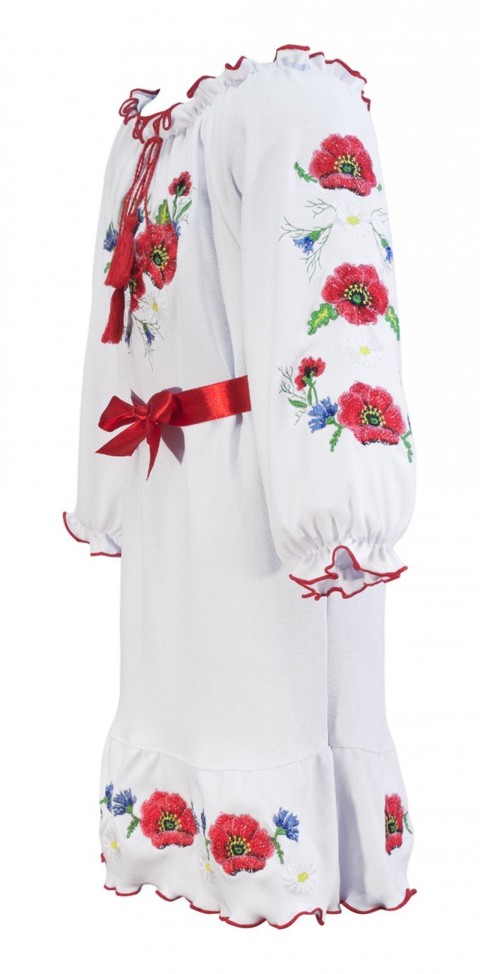 Белое трикотажное платье с чудесной вышивкой красных маков и полевых цветочков, вышито впереди на груди, рукава и нижняя оборка (впереди и сзади). Круглый глубокий вырез присборен на резиночку, длинные пышные рукава внизу так же присборены. Дополняет платье красный атласный пояс.
