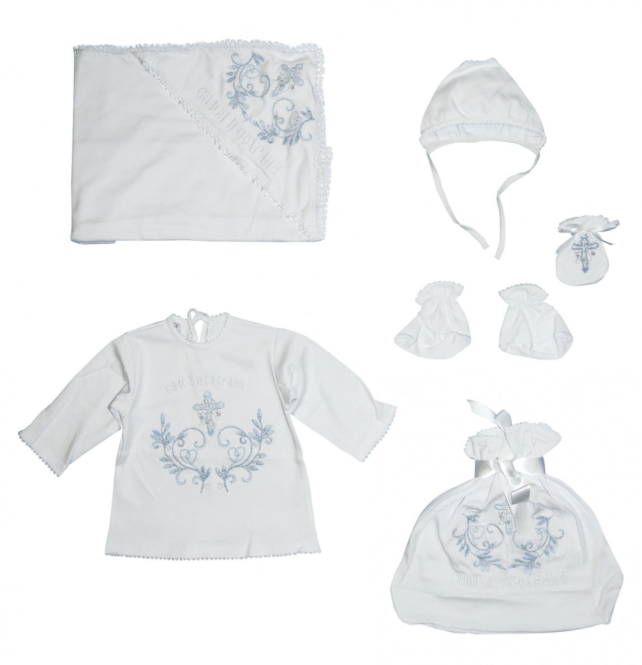 Прекрасный белый трикотажный набор для крещения с красивой вышивкой.