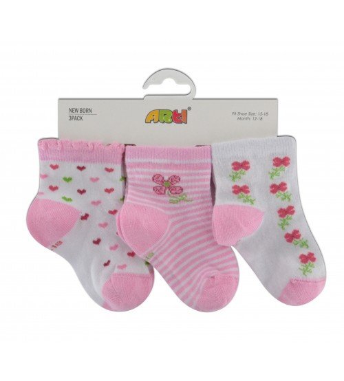 В комплект входит три пары белых носочков с розового цвета пяточкой и носочком - в цветных сердечках, в розовую полосочку и с цветочками. Носочки мягкие и приятные на ощупь. После стирки не линяют и не садятся, предварительно проходят тест стирки и усадки Sanfor. Идут с антибактериальной пропиткой.