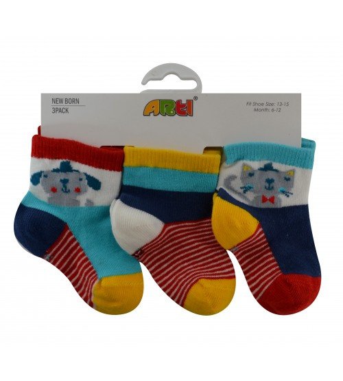 Чудный комплект из трех носочков яркой расцветки (красные, синие, желтые и бирюзовые цвета) и изображением зверушек - с песиком, полосатые, с котенком. Носочки мягкие и приятные на ощупь. После стирки не линяют и не садятся, предварительно проходят тест стирки и усадки Sanfor.  Идут с антибактериальной пропиткой.