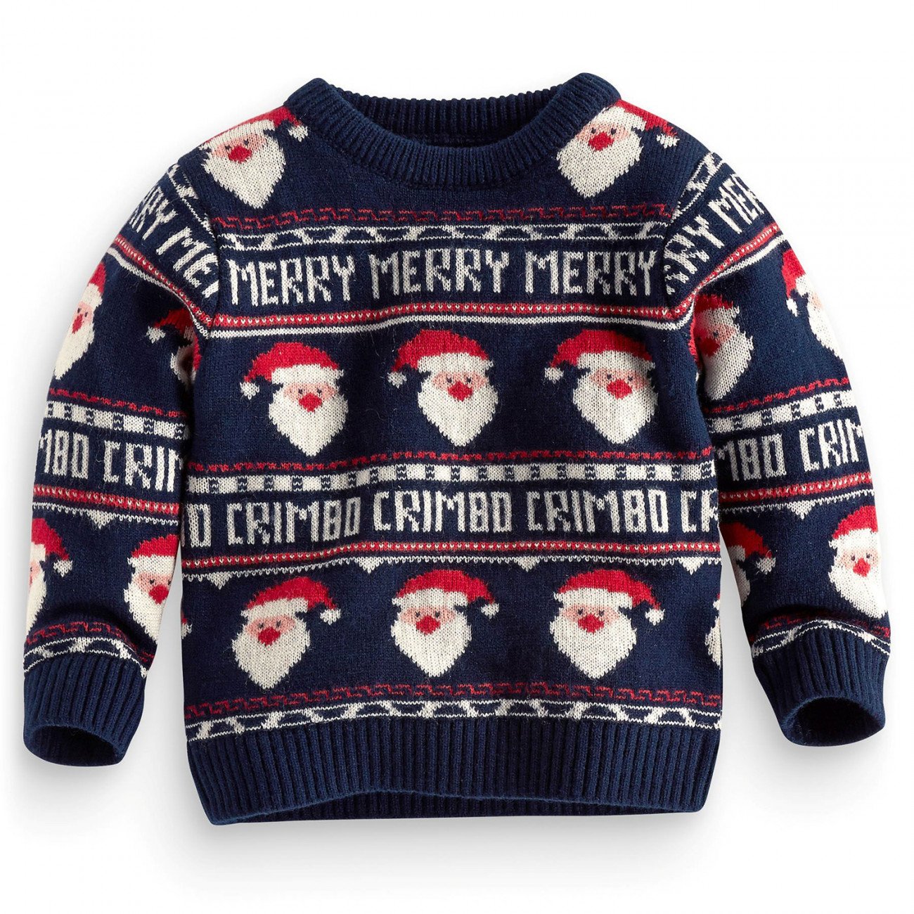 Чудесный темно-синий свитер с Санта Клаусами и надписью "Merry Crimbo" ("Счастливого Рождества", Crimbo - аббревиатура Christmas). Горловина, внизу свитера и рукавов, вязаная резинка темно-синего цвета.