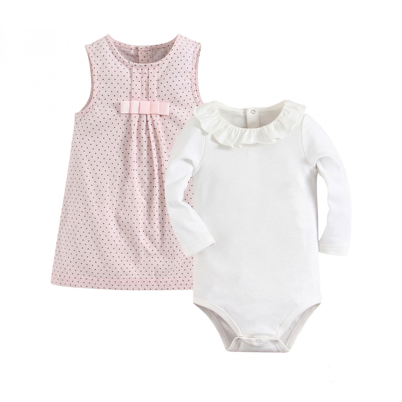 В комплект входит красивый нежно-розового цвета в маленький темный горошек вельветовый сарафанчик, впереди есть складочки украшенные нежно-розовым бантиком. Сзади сарафан застегивается на пуговички, для удобства в одевании. Прекрасно дополняет комплект бодик белого цвета с длинным рукавом, по вырезу горловины украшен рюшем из хлопковой ткани. Сзади и снизу под памперс застегивается на кнопочки.