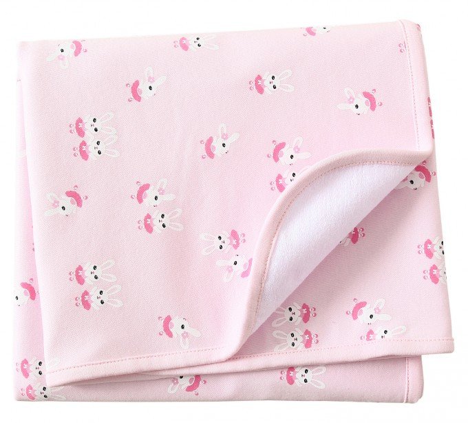 Розового цвета пеленка с изображением маленьких зайчиков, по краю обработана розовой окантовкой.