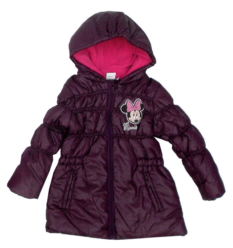 Курточка темно-фиолетовая с мелким неярким рисунком леопардовых пятнышек. Рукава по длине и курточка впереди и сзади в верхней части присборены на резиночки. Внизу два врезных карманчика на замочке. С левой стороны украшена аппликацией Минни. Внутри утеплена синтепоном, подкладка в капюшоне из ярко-розового флиса, внутри курточки подкладка из темно-фиолетового нейлона.