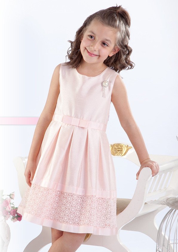 Однотонное платьице без рукавов из ткани светло-розового цвета с легким блеском. Сверху приталенное, юбка платья присборена в небольшие складки. Низ юбочки декорирован вставкой из кружева по краям с широкой рапсовой лентой в тон. Красиво подчеркивает талию поясок из рапсовой ленты с бантом впереди. Внутри платьица есть хлопковая подкладка. С левой стороны сверху украшено брошью с большой жемчужиной и стразиками.