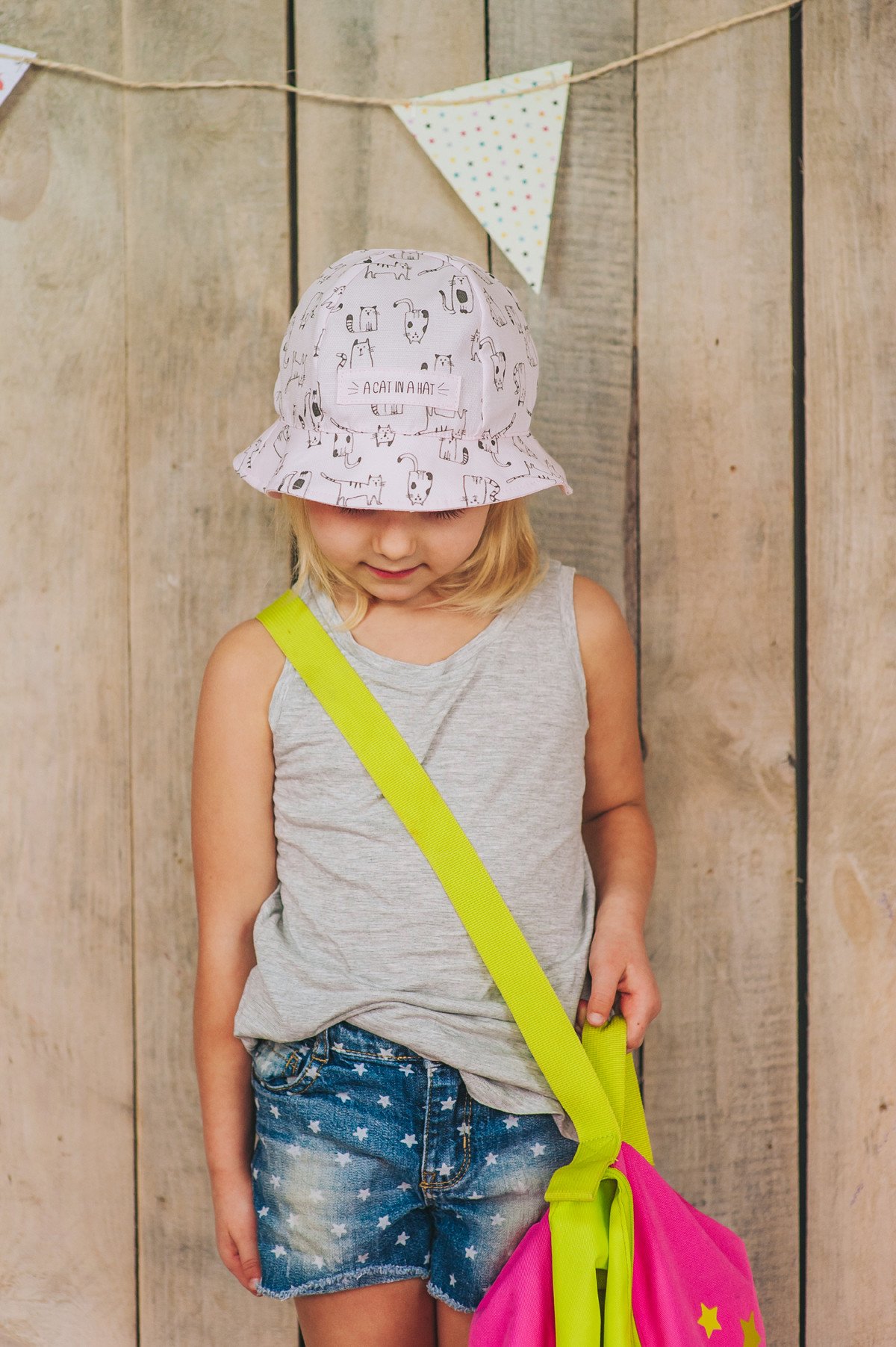 Прекрасная летняя панама для маленькой модницы. Панамка нежно-розового цвета с изображением кошечек. Впереди нашивка в тон панамке с надписью "A cat in a hat".