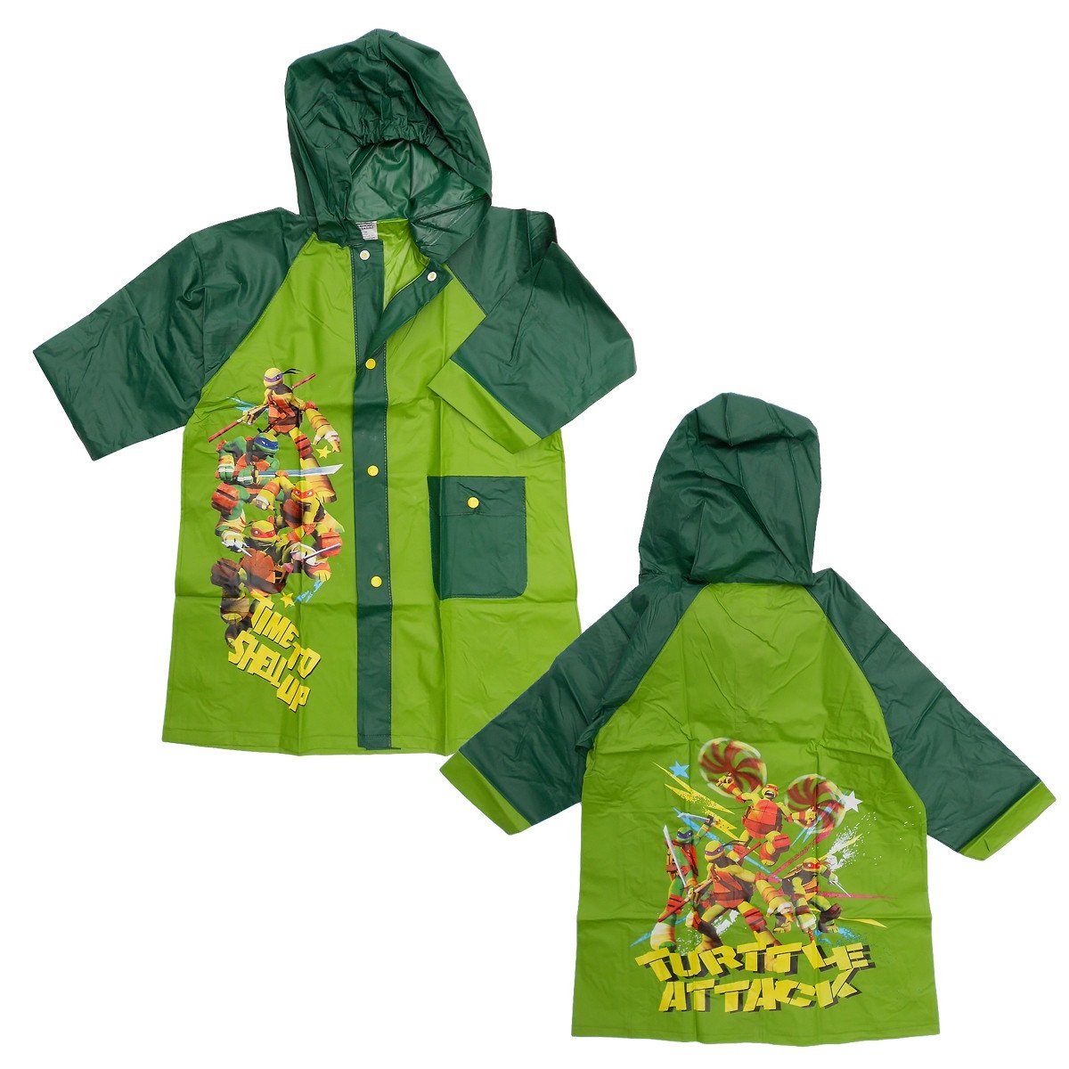 Дождевик-плащ светло-зеленого цвета впереди с изображением Черепашек-нинзя. Рукава, капюшон, планка под кнопки и карманчик темно-зеленые. Застегивается на кнопочки. Впереди есть накладной карманчик, с клапаном на кнопочке. Осталось купить