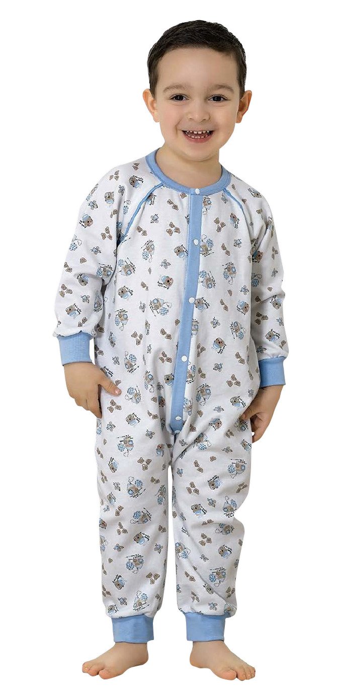 Удобный и свободный человечек с открытыми стопами. Человечек молочного цвета с изображением маленьких мордочек мишек. Внизу рукавчиков, штанин, планочка под кнопочки и окантовка горловины голубого цвета. Впереди застегивается на белые кнопочки.