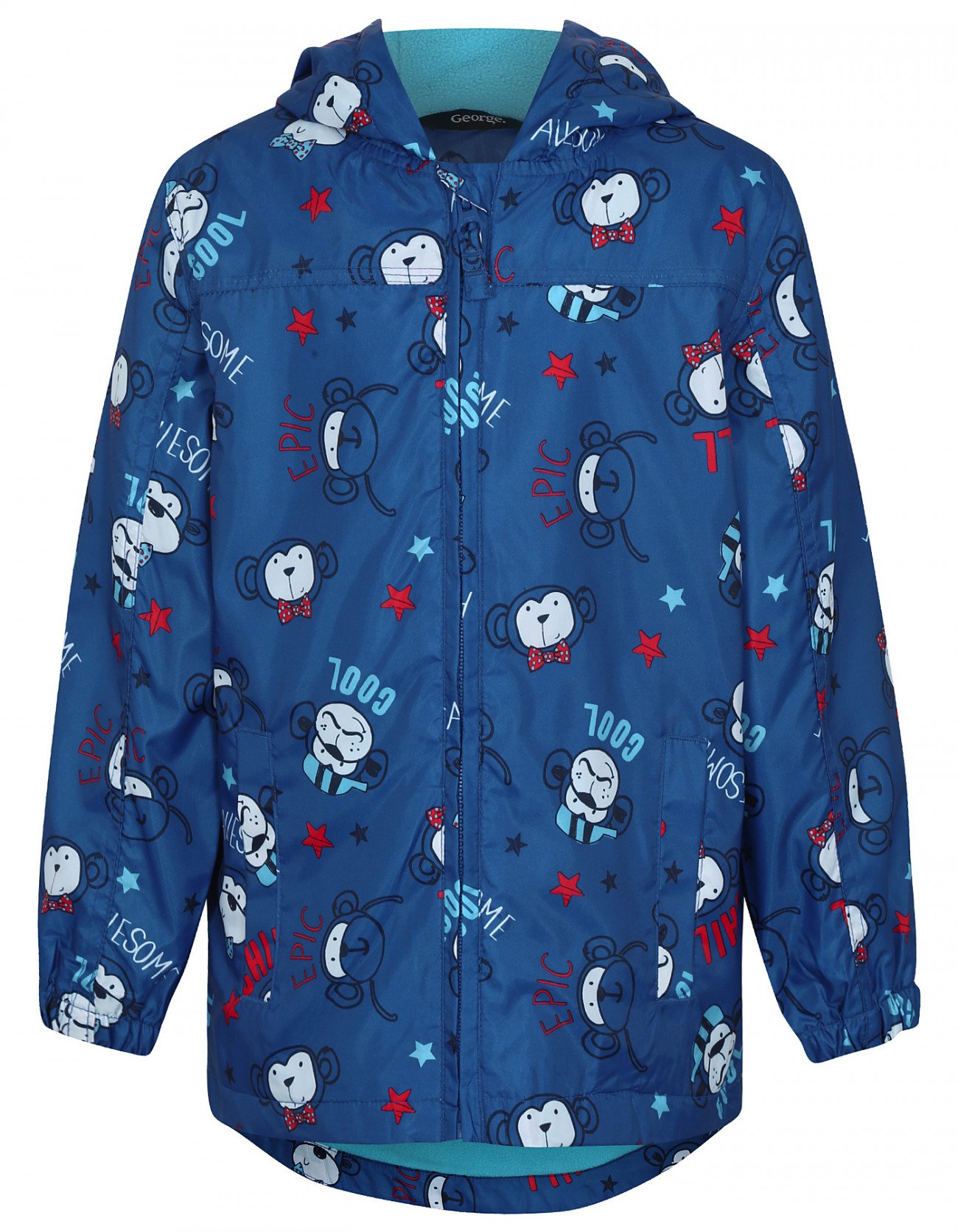Синего цвета ветровка с изображением мордочек обезьянок и красных, голубых звездочек. Идет с капюшоном, внутри на флисовой подкладке, в рукавах без флиса. Застегивается на замочек, есть два врезных кармана впереди. Сзади ветровка удлиненная.