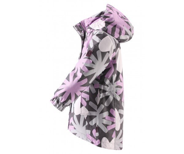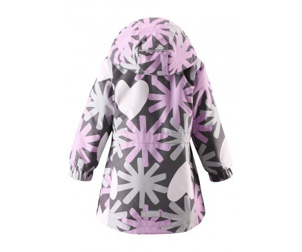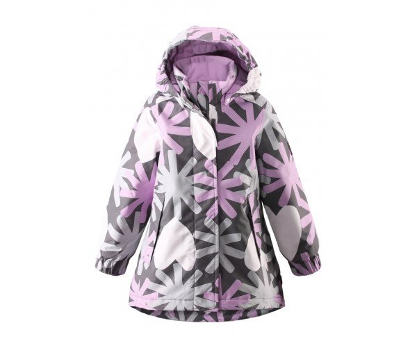 Зимняя курточка Reima серая с сиреневыми и светло-серыми снежинками, белыми сердечками для девочки.Удобная и продуманная модель зимней курточки. Оригинальный дизайн, качественное исполнение, внимание к мелочам.