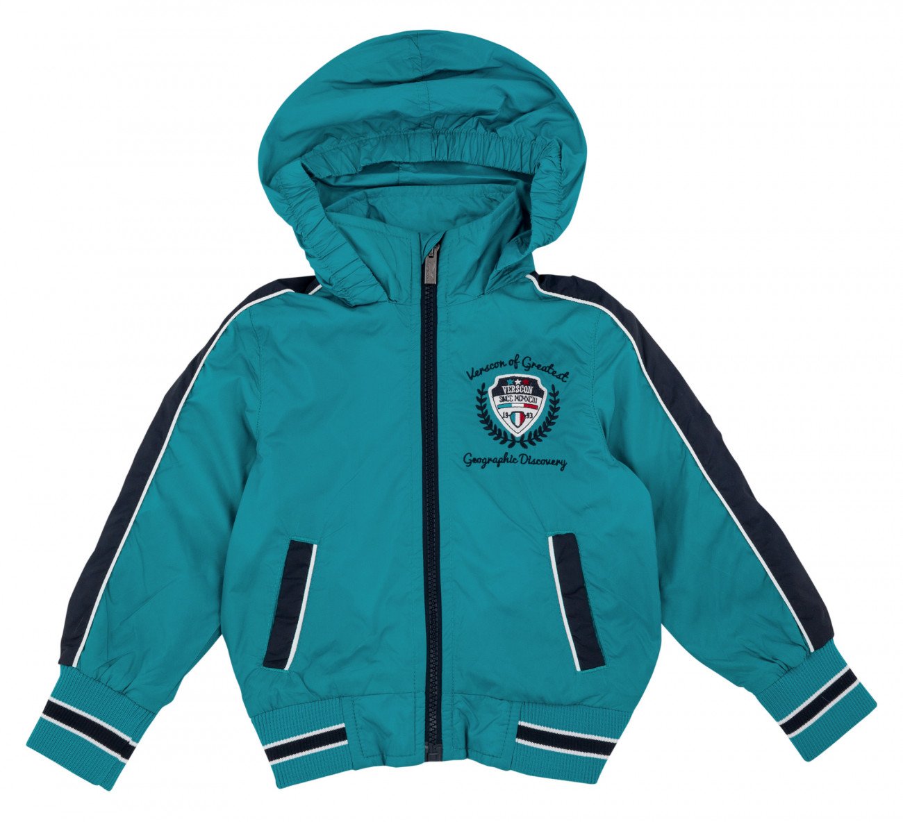 Ветровка красивого бирюзового цвета с темно-синими вставками сверху на рукавах, по краю карманов. Впереди ветровочка застегивается на темно-синюю молнию, по бокам два врезных кармана с темно-синей обработкой по краю. С левой стороны украшена вышивкой названия бренда. В воротнике курточки спрятан капюшон (одинарная плащевка, сверху присобран на резиночку). Внизу ветровки и рукавов вставлена трикотажная резиночка бирюзового цвета с темно-синей полосой посредине. Внутри на хлопковой подкладке темно-синего цвета.