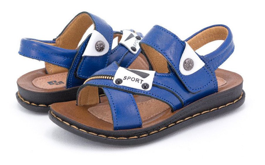 Модные ярко-синие открытые босоножки с белыми нашивками на заклепках для мальчика. Застегиваются на липучку. Сверху и внутри выполнены из натуральной кожи, стелька идет с супинатором. Мягкие и удобные, подошва хорошо гнется. Подойдут на любую по полноте ножку и любой подъем.