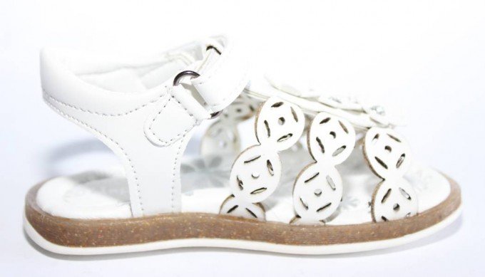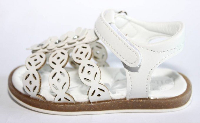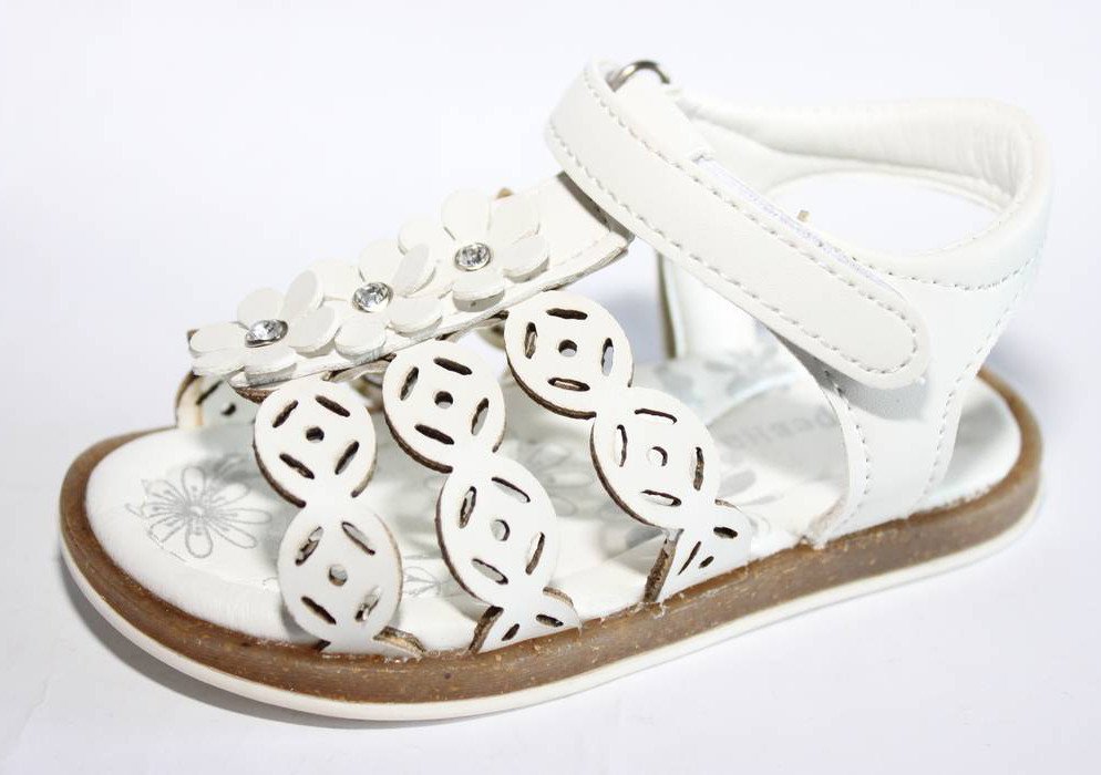 Летние открытые босоножки белого цвета украшены цветочками внутри с стразами и перфорацией по бокам. Застегиваются на липучку. Сверху выполнены из искусственной кожи и внутри из натуральной, стелька идет с супинатором. Мягкие и удобные, подошва хорошо гнется. Подойдут на обычную ножку и обычный подъем.