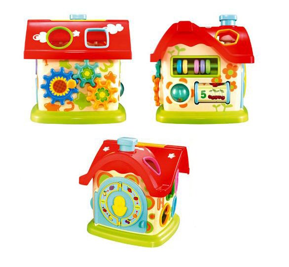 Красочная многофункциональная игрушка обязательно понравится малышам. Прежде всего домик используется как сортер. С одной стороны домика и сверху размещены отверстия для фигурок. Ребенок сможет изучать разные фигурки и цвета. С другой стороны размещены часики с циферблатом из фруктов и овощей с одной стороны и цифр с другой стороны. Малыш сможет познакомиться со временем и выучить названия фруктов и овощей. Еще с одной стороны размещены счеты и барабан с цифрами и ягодками. Ребенок сможет выучить цифры и научиться счету. И на четвертой стороне домика размещен механизм, с помощью которого можно открывать дверцу в домик и доставать фигурки.