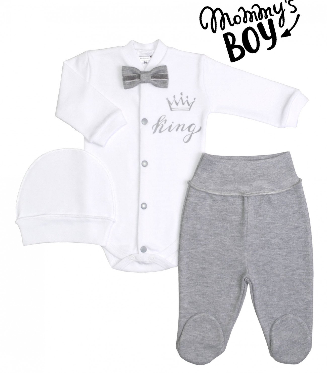 Бодик с длинным рукавом. Белого цвета, слева на груди надпись "King" и изображение короны. Украшен трикотажным бантиком (съемный). Застегивается на кнопочках. На манжетах отворачиваемые антицарапки.