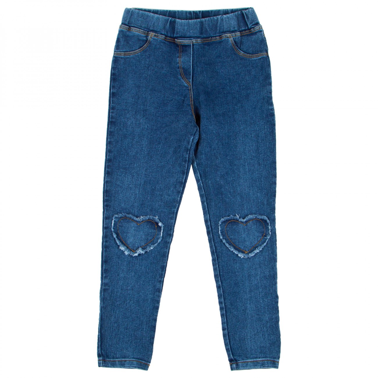 Синие джеггинсы, зауженные книзу. Впереди имитация двух карманов, сзади два накладных кармана с желтой окантовкой по краю. В поясе на резинке, резинка не регулируется. На коленках аппликация сердечек с бахрамой, внутри с желтой строчкой в виде сердечка.